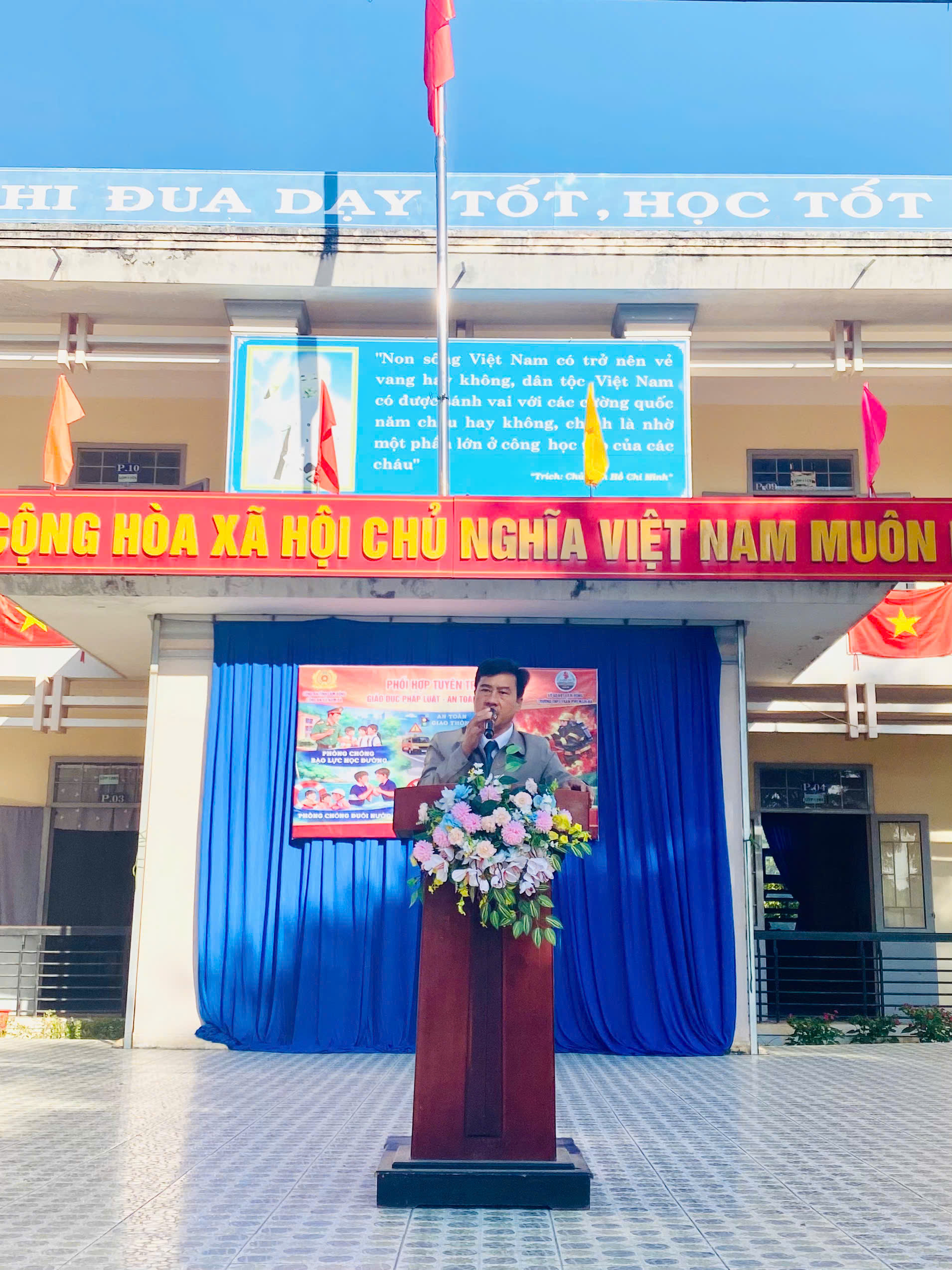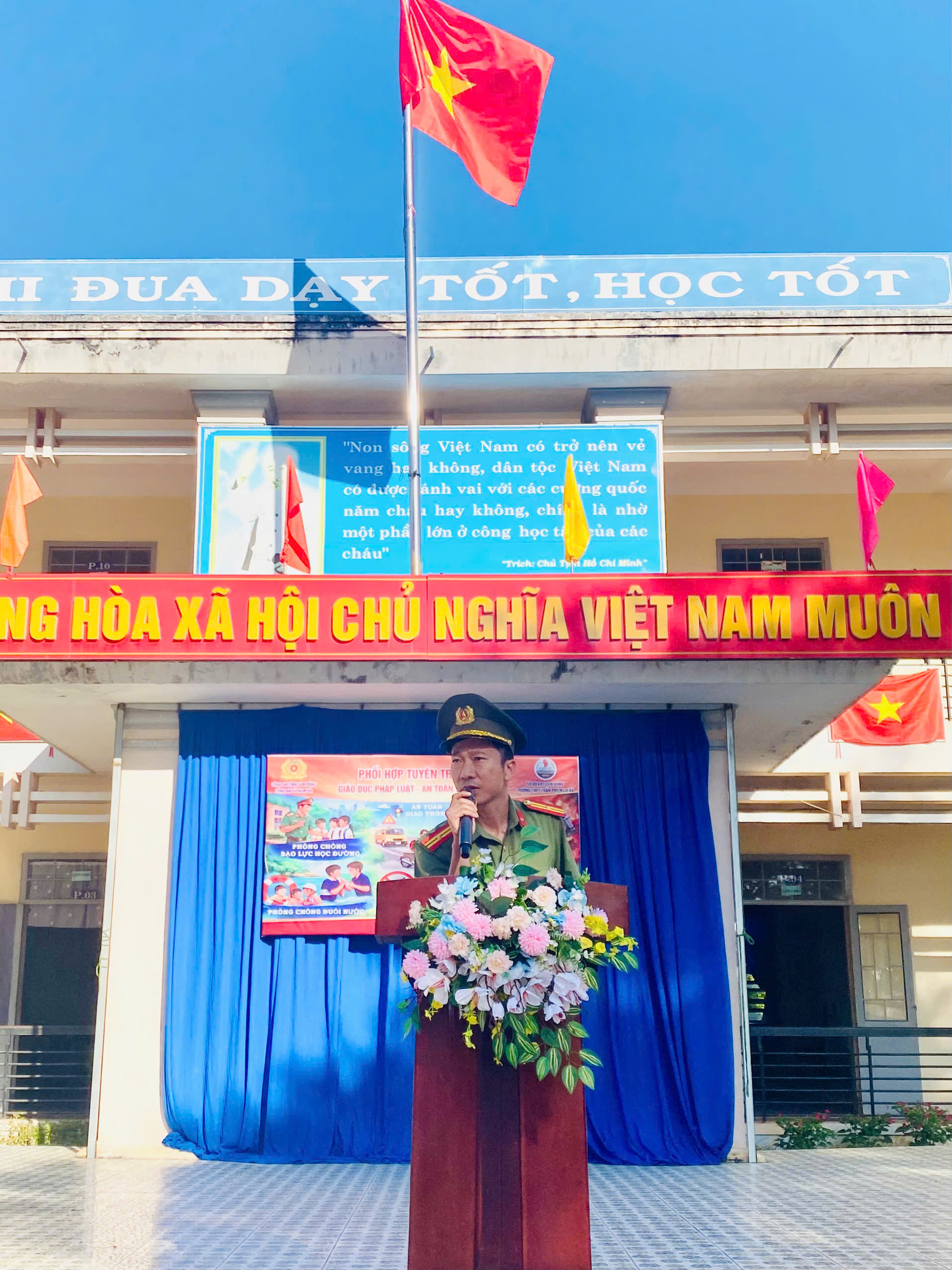 Tiếp đó, thầy Huỳnh Cao Đông đại diện Ban Giám hiệu nhà trường đã phát biểu cảm ơn Công an xã Nam Đà, tỉnh Lâm Đồng đã phối hợp tổ chức chương trình tuyên truyền thiết thực. Thầy nhấn mạnh tầm quan trọng của việc trang bị kiến thức pháp luật, đặc biệt là các kỹ năng an toàn cần thiết cho học sinh, đồng thời nhắc nhở học sinh nghiêm túc lắng nghe, tiếp thu đầy đủ các nội dung được truyền đạt.